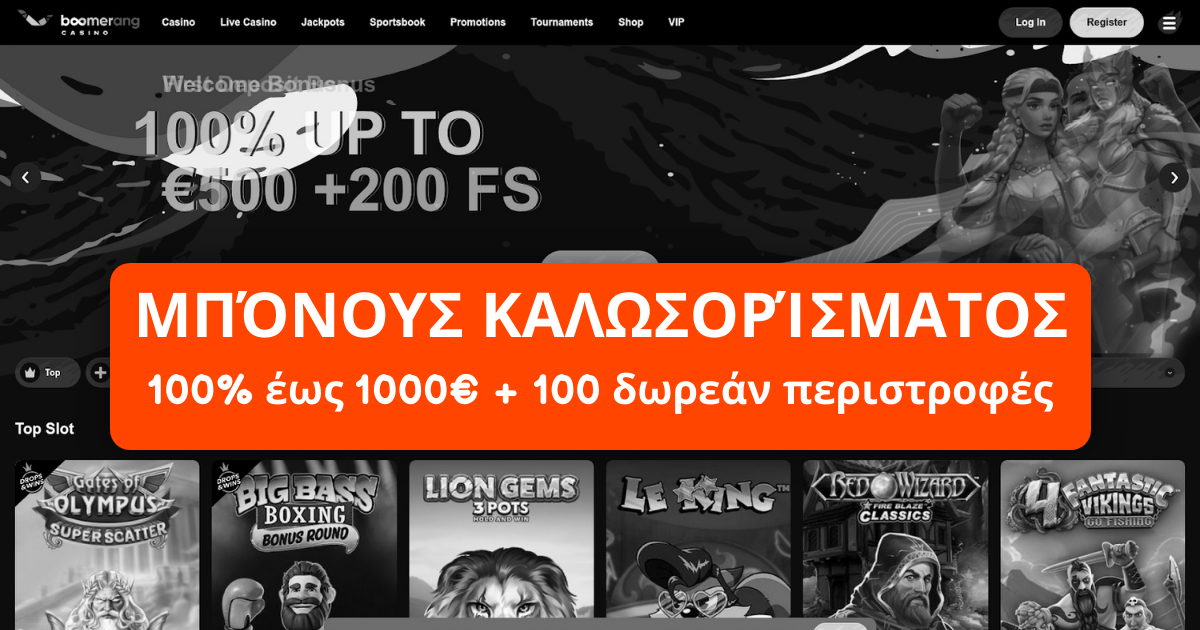 Το Boomerang Casino διαθέτει προσφορά καλωσορίσματος που δίνει έμφαση τόσο στην ενίσχυση του πρώτου κεφαλαίου όσο και στη διάρκεια του παιχνιδιού, συνδυάζοντας μπόνους κατάθεσης με δωρεάν περιστροφές. Η πρόταση είναι διατυπωμένη ως (100% έως €500 + 200 FS, 55x (κατάθεση + μπόνους)). Σαφές πλαίσιο. Συγκεκριμένα μεγέθη.